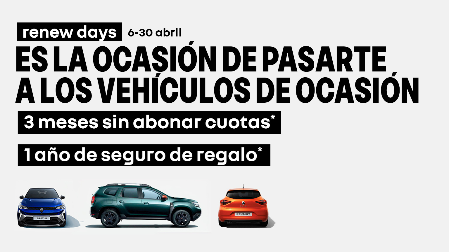 ¡Llegan los renew days! Es la ocasión de pasarte a los vehículos de ocasión. Con 3 meses sin abonar cuotas y un año de seguro de regalo.
